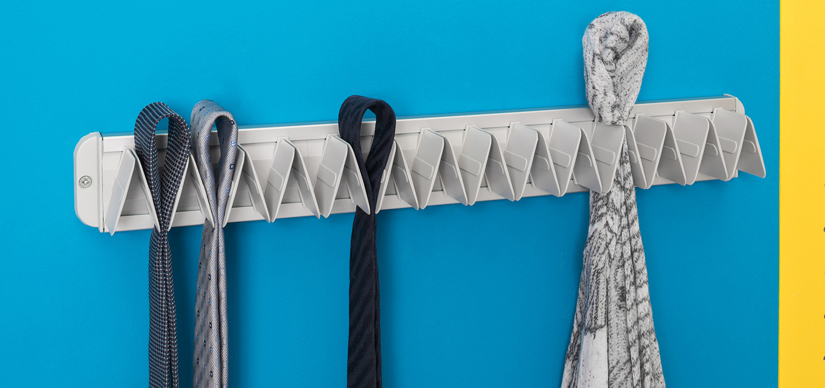 A profile in silver anodized aluminum which can be fixed inside the wardrobe, on the doors or directly to the wall. It features a modern, original line, the clips are in nylon reinforced with fiberglass and are of a refined light grey colour, for easy positioning of ties, belts and scarves.
